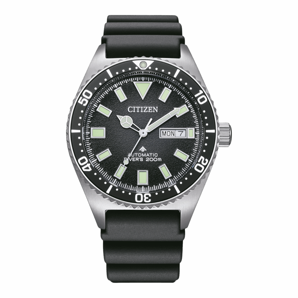 Abtauchen zum Einstiegspreis – der Citizen Promaster Automatik-Diver bietet echte Taucheruhren-Funktionalität für wenig Geld. Die Citizen Promaster Diver NY0120 richtet sich an alle, die eine robuste Taucheruhr mit Automatikwerk im Einsteiger-Budget suchen. Citizen – ebenfalls ein japanischer Hersteller – ist bekannt für seine Promaster-Taucheruhren, und dieses 41 mm Modell macht hier keine Ausnahme. Mit einer Wasserdichtigkeit von 200 m (20 Bar) erfüllt sie die ISO-Norm für Taucheruhren, was durch die einseitig drehbare 60-Minuten-Lünette und gut verschraubte Krone unterstützt wird. Im Herzen tickt Citizens Automatik Kaliber 8204 (aus der eigenen Miyota-Werksfamilie), ausgestattet mit Handaufzug und Tages-/Datumsanzeige. Die Uhr kommt meist an einem schwarzen Kautschuk-Taucherband, ideal für den Nass-Einsatz. Das Design ist funktional: große, mit Leuchtmasse gefüllte Indizes und Zeiger sorgen für beste Ablesbarkeit im Dunkeln oder unter Wasser. Mit einem Preis von ungefähr 250–300 € bietet die Promaster erstaunlich viel – sie kostet teils nur die Hälfte unseres Preislimits, liefert aber schon Profi-Merkmale für Hobbytaucher.